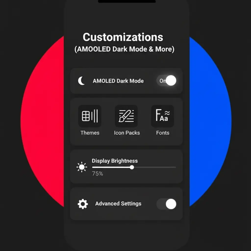 Select themes to apply AMOLED dark theme or standard dark theme. These options consume less power, reduce eye strain, and cause less fatigue during extended viewing sessions.